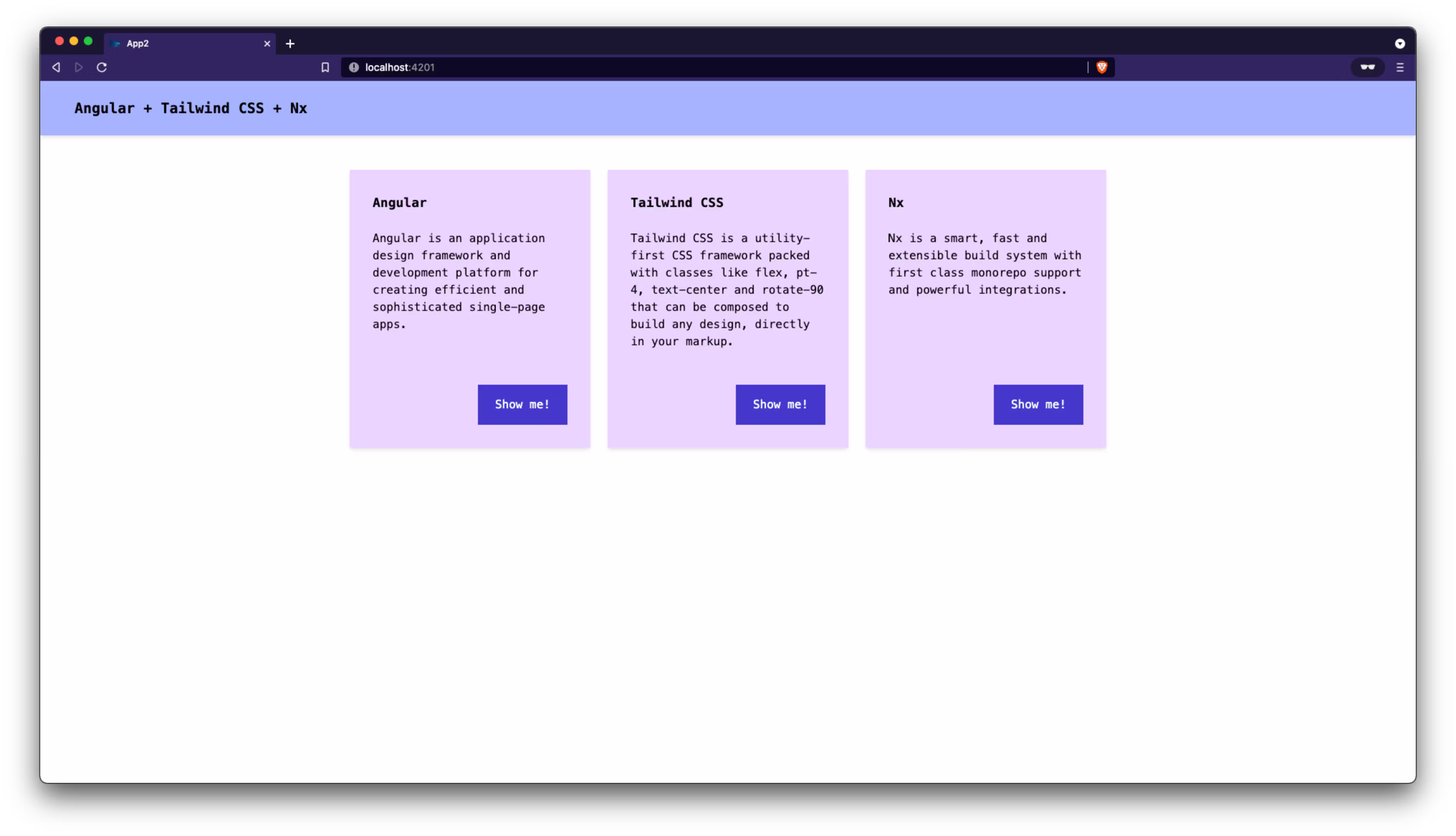 2 <header class="px-xl py-md bg-primary-light text-xl font-bold shadow-md">Angular + Tailwind CSS + Nx</header>